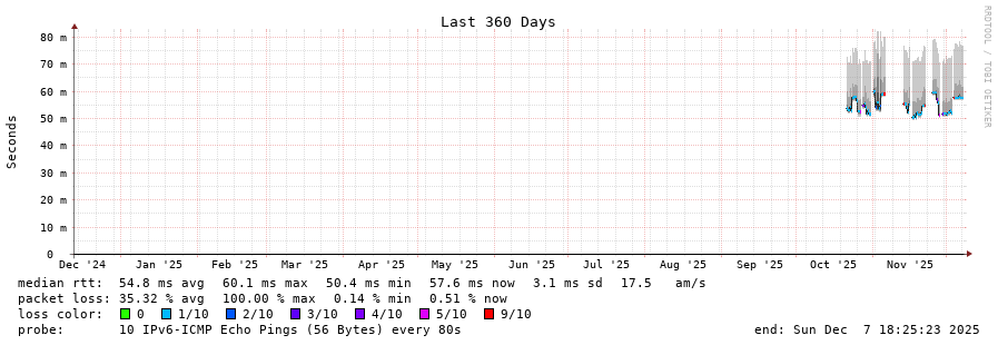 traceroute to 2001:470:1f13:814:1ad6:c7ff:fe2a:502 (2001:470:1f13:814:1ad6:c7ff:fe2a:502), 30 hops max, 80 byte packets - Generated at 2025-12-07 11:15:01