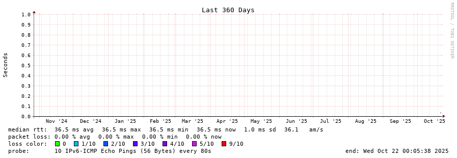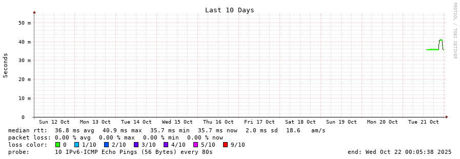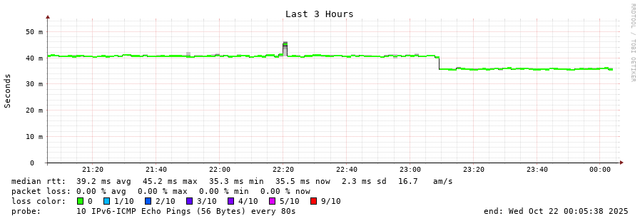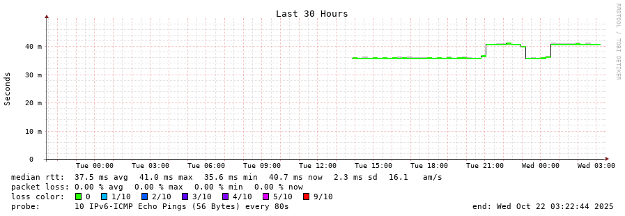 10 > 2a02:2f00:8708::b5 (2a02:2f00:8708::b5) [AS8708] 26.983ms 26.951ms 26.957ms